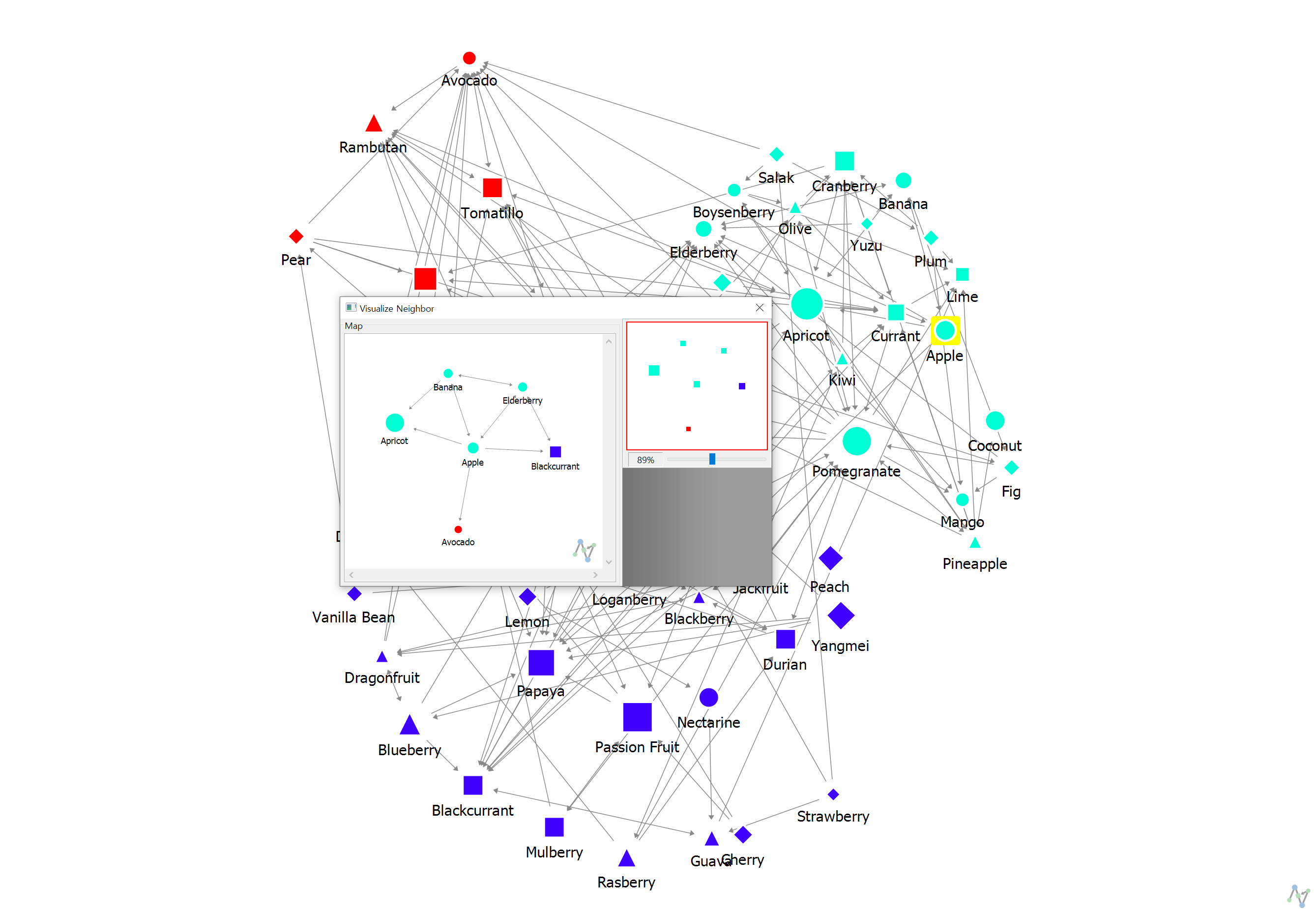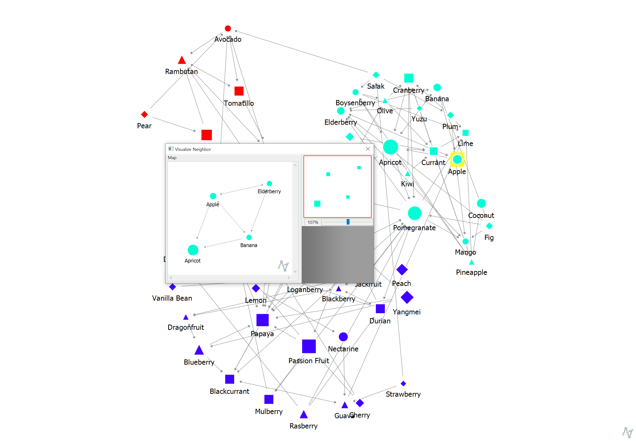 위 케이스는 다른 팀과의 커뮤니케이션에 관련한 네트워크를 도식화한 후, Apple 노드를 우클릭해서 Visualize Neighborhood를 한 결과입니다. 해당 케이스를 보여드리는 이유에 대해 설명드리면 Apple은 회사의 PR Manager입니다. Apple의 Task 중 하나는 외부 PR을 위한 콘텐츠가 있는데, 당시 하나의 아이디어로 내부 구성원을 인터뷰해서 PR 콘텐츠를 만들자는 아이디어가 있었습니다. 그러기 위해서는 Apple이 구성원 소식을 잘 알고 있어야 하는데, 네트워크를 보면 Avocado와 Blackcurrent만 연결되어 있는 것을 알 수 있습니다(최대 3명이기 때문에 한 명이 연결되어 있어야 한다고 생각)