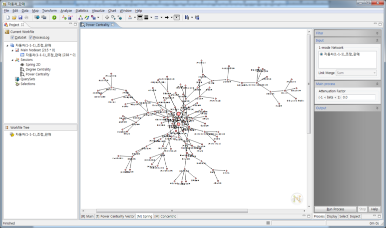 - 넷마이너 왼쪽에서 Jarvinspire_ 네트워크분석(배포용)_hierarchy를 클릭 후, 상단 메뉴에서 Visualize → Spring → 2D를 클릭합니다. 클릭하시면 아래와 같은 화면이 출력됩니다.