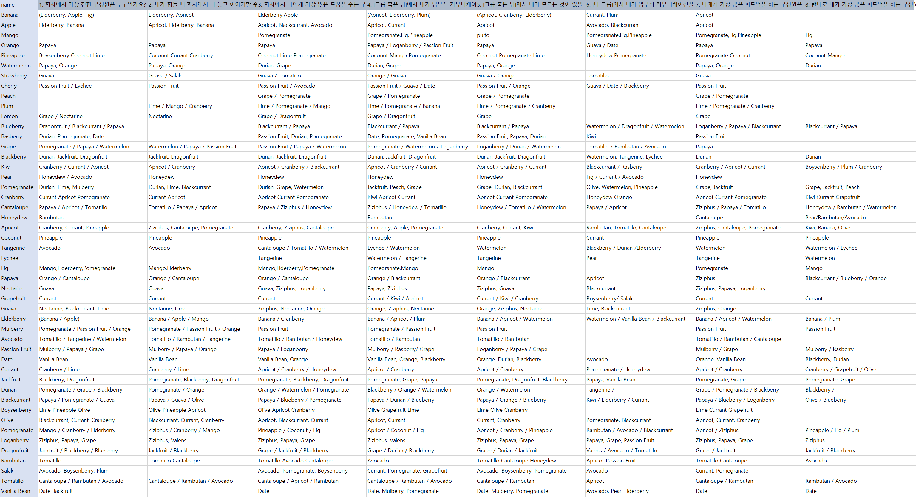 - 가령, raw sheet의 B2 table에는 Elderberry, Apple, Fig라는 데이터가 들어가 있는데 이 데이터를 relationship_1 sheet의 B2, B3, B4로 쪼갠 형태입니다.